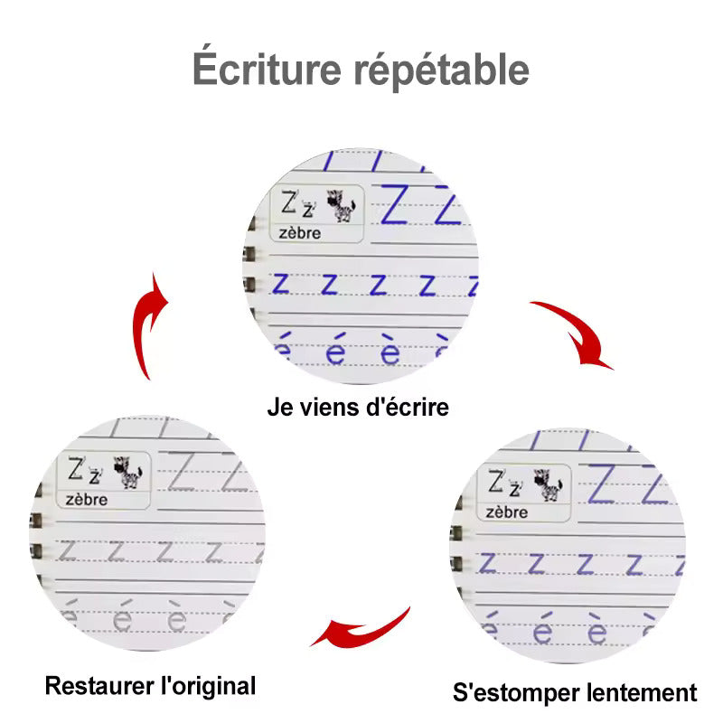 4 Cahiers d'écriture : Alphabet, Nombres, Dessin et Mathématiques. Offert : 1 Stylo magique avec 5 recharges + 1 Grip d'aide à la tenu du stylo
